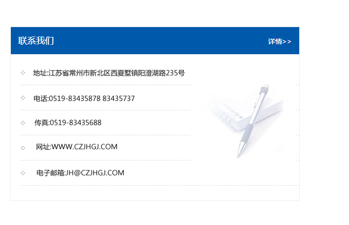 地址:常州市新北區友邦商務大廈1幢16、17層  電話:0519-85101652  傳真:0519-85112595  郵編:213022  網址:www.cz-jiayue_cn.hbddw.com  郵箱:xiajifengaa@163.com